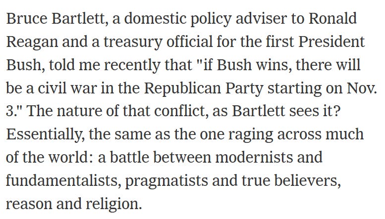 A few days later, however, I learned that the Suskind article had been distributed to news organizations and I was very extensively quoted making disparaging comments about President George W. Bush. Although I was accurately quoted, it was embarrassing to me because I worked for a conservative think tank that was closely allied with the administration. Bush’s top political adviser Karl Rove called my boss directly to complain that I was not being a team player, and I was berated for my comments. I was later fired by this organization after writing a book that was critical of Mr. Bush. Ironically, my principal criticism was that Bush was not sufficiently committed to conservative principles, a view no conservative would disagree with today.