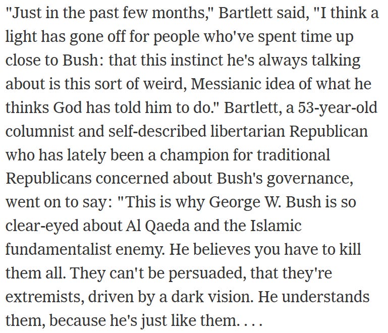 Then one day I got a call from a New York Times Magazine factchecker, saying that I was being quoted in an upcoming article by Suskind. The factchecker did not read my quotes to me or indicate their context. I was simply asked whether I said this or that and said that I did. I was often quoted in the Times and gave it no further thought.